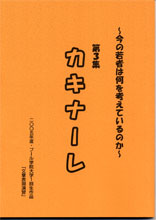 カキナーレ 第3集 ~今の若者は何を考えているのか~ 2005年度 プール学院大学1回生作品 「文章表現演習」 サイズ:A4版 まだ少し在庫がありますので、ご希望の方には実費のみでお分けいたします。 注文はこちらから |