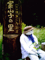 たっぷり休養した二人は、また車で「東祖谷」に向い、テレビでも紹介されていた〈案山子の里〉を訪ねた。案山子の作り手の方は仕事でおられなかったが、姑の方が留守番をしておられた。親切に家にまであげてもらった。太い梁を渡した本格的な日本の家屋だった。天井から大きな提灯が二つぶらさがり、自在鉤が吊るされた囲炉裏があった。少し耳が遠いとのことで、大きな声で話した。近くの道路、バス停留所、畑には手作りの案山子がたくさん据えられていた。バス停の前の道路際に坐している案山子は、後ろ向きで帽子を被っており、もう少しで声をかけそうになった。停留所には、2体の案山子があり、1体はギターを弾いていた。静かな時間が流れていた。悠久につづくであろう村の営みを想像した。近くの山には狸や鹿など多くの動物たちが生息しているだろう。その動物たちと村人たちとの「交感」の物語も多く語られてきたに違いない。帰路は剣山を越える山道を走った。目に入る限り杉山で、現に杉材を満載したトラックに出合った。これでは、クマをはじめ動物たちの食料がなくなり、棲めないはずだ。「日本熊森協会」の人たちによる植林(クリその他動物たちの食べ物がなる木)のことを思った。剣山のヘアピンカーブを長い時間走り続け、ようやく美馬の街に出、一路淡路島に急いだ。