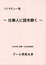 インタビュー集 ~大人に仕事と人生の話しを聴く~ 2005年度 プール学院大学1回生作品 「文章表現演習」 サイズ:A4版 まだ少し在庫がありますので、ご希望の方には実費のみでお分けいたします。 注文はこちらから |