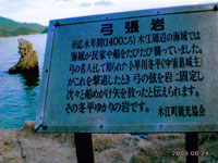 竹原まで車で送ってもらい、大崎上島ゆきのフェリーの港に着いた。午後3時の便にギリギリ間に合った。挨拶とお礼をもそこそこに船の上の人となった。広島県側の島々に目を向けるうち、たちまち30分たち、垂水港に横付けされた。港には卒業生の父上が迎えに来てくださっていた。「まだ島を一周していませんでしたね。」と、父上は周辺40kmという島を案内された。つい2年ほど前まで勤めておられたセメント会社の横を通った。「いつまでもやってるとね。若い者に譲りました。」そうこうしていると、車が止まった。海に突き出した「弓張岩」という看板が立っていた。その説明によると、1400年ころ、このあたりの土地に海賊が出没して、民家や船を荒らしたらしい。そこで城主で弓の名人である小早川冬平が撃退したとある。